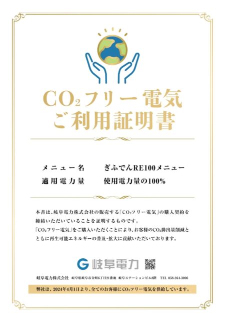 本書は、岐阜電力株式会社の販売する「CO2フリー電気」の購入契約を締結いただいていることを証明するものです。